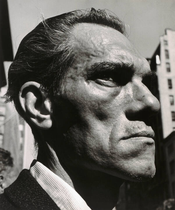 1948. Employed as an advertising layout artist, Levinstein photographed primarily on weekends and holidays. He took particular interest in the activity of the street—the bodies and gestures of strangers. Levinstein’s work often suggests a tension between intimacy and estrangement. The subject of this photograph, for example, is recorded at close proximity, giving the work a confrontational quality, while the unusual camera angle imparts a psychological distance.