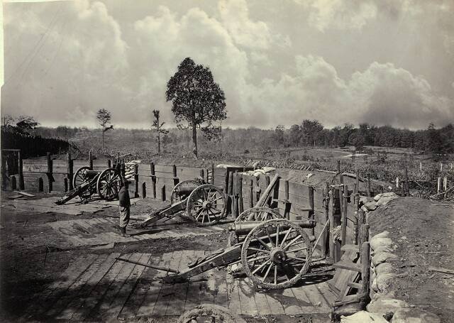 George Barnard enjoyed a 40-year career as a photographer, beginning as a daguerreotypist in 1846. One of the most active Civil War photographers, Barnard is best known for his documentation of General William T. Sherman's campaigns in the western theater of the war. Barnard accompanied Sherman's forces during the occupation of Atlanta and the infamous March to the Sea, in the summer and fall of 1864. This view depicts Union soldiers occupying a former Confederate fort on the outskirts of Atlanta. The clouds in the sky, laboriously printed from a second glass-plate negative, were added by Barnard for aesthetic effect.