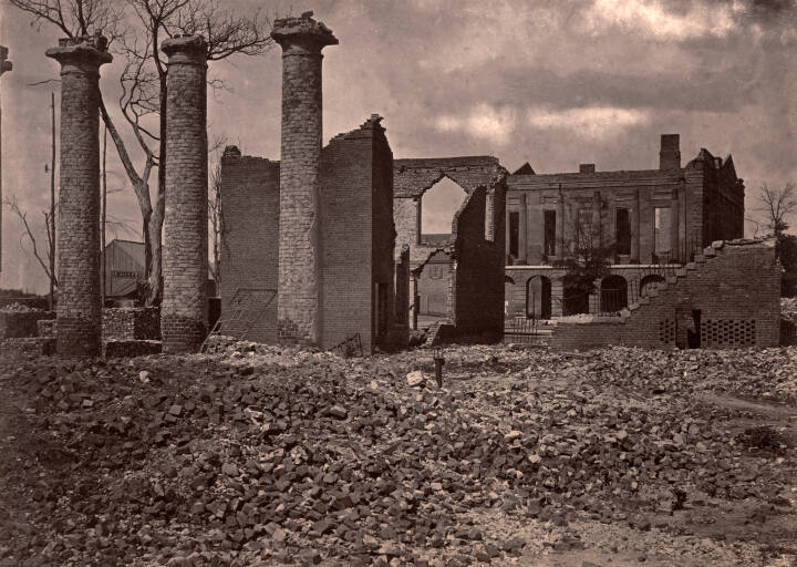 These skeletal ruins were all that remained of a building in Columbia, South Carolina after Union General William T. Sherman marched his armies through the city. His troops carried out a scorched-earth campaign during their 285-mile march from Atlanta to Savannah during the final months of the American Civil War.