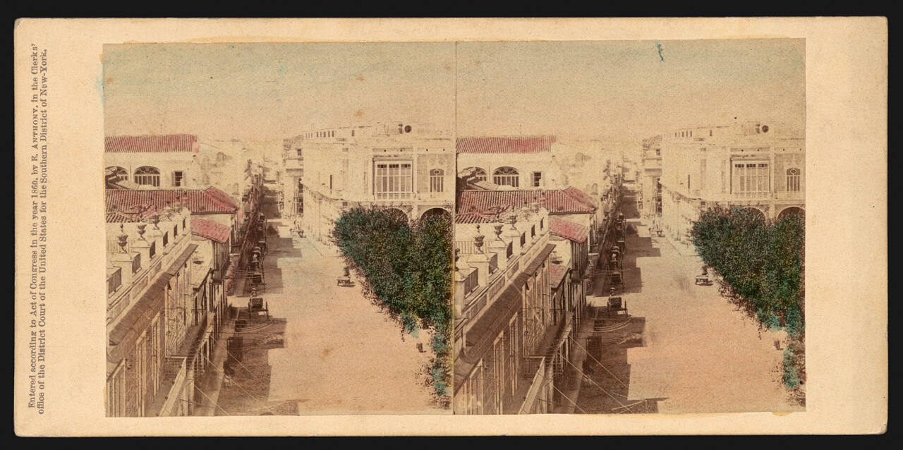 InscribedOn mount verso, center, white label, in black type: "SCENES IN CUBA - VISTAS CUBANAS. / No. 61. / View from the Palace of the Conde de Santovenia, looking up the Calle de Obispo. / Havana. / Vista desde el Palácio del Conde de Santovenia, mirando hácia fuera, Calle del Obispo."