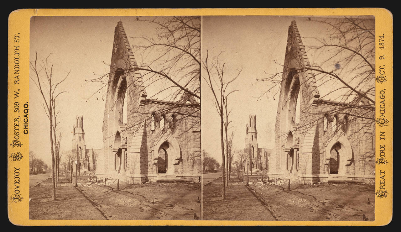 On mount verso, center, white label, in black type: "AMONG THE RUINS IN CHICAGO. / No. 52 / New England & Unity Unity Churches, looking north on Dearborn St.".