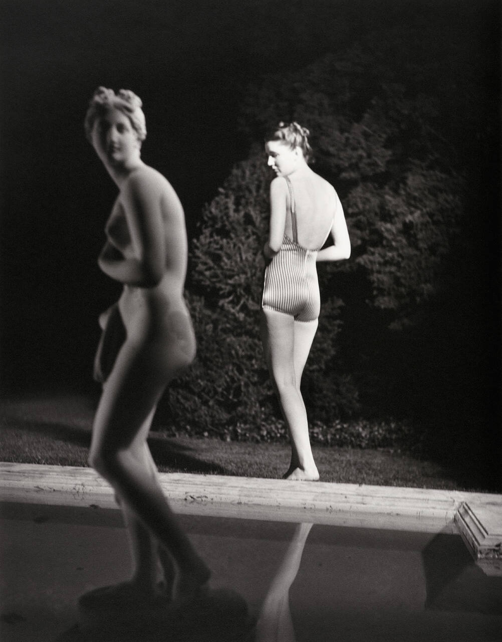 Model Margaret Minnigerode stands at the edge of a pool as though lost in thought, her body turned away from Louise Dahl-Wolfe’s camera. Brightly lit by a car’s headlights, Minnigerode’s exposed back, bent arms, slightly bent knee, and updo echo the out-of-focus statue of a bathing Venus (the Roman goddess of love and beauty) located on the other side of the pool. This photograph was featured in the June 1939 issue of Harper’s Bazaar. Dahl-Wolfe worked for the magazine for more than 20 years, revolutionizing fashion photography with her images of effortlessly chic women photographed outside of the studio.