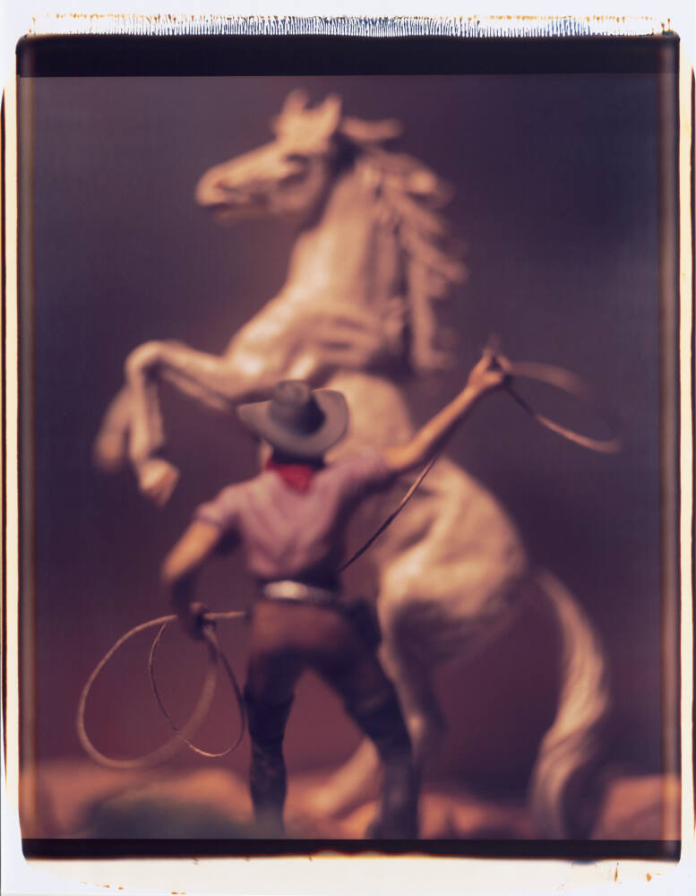 DescriptionRearing horse; cowboy with a rope standing in front of horse.Gallery LabelSince 1972, Levinthal has photographed toy figures in order to explore aspects of our collective visual iconography. His "Modern Romance" series was inspired by the images of film noir and the look of Edward Hopper paintings. His "Western Series," begun in 1986, reflects Levinthal's childhood love of western movies and television programs. Working with a large 20x24-inch Polaroid camera, Levinthal uses this device's inherently shallow depth of field to heighten the ambiguity of his subjects. These images, like the frontier myths they evoke, are both iconic and artificial, a hybrid of fact and romance.