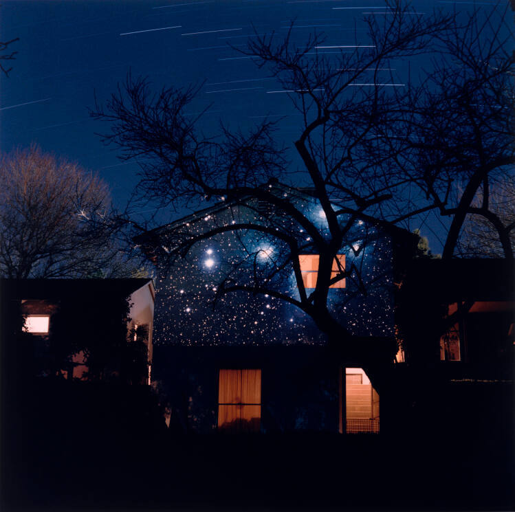 Deeply fascinated by time, Lewis DeSoto’s photographs examine, in his words, “the notions that man has about his existence in relation to the particular and to the infinite.” Here, DeSoto juxtaposes the safe, comforting presence of a house with the expansiveness of the universe, represented by the celestial image projected onto the structure. Although the gap between mankind and the surrounding universe seems vast, DeSoto maintains that we are all connected, individual expressions of the same forces and processes. The star tracks in the sky, resulting from a long exposure, underscore DeSoto’s continued interest in time and man’s place within the cosmos.