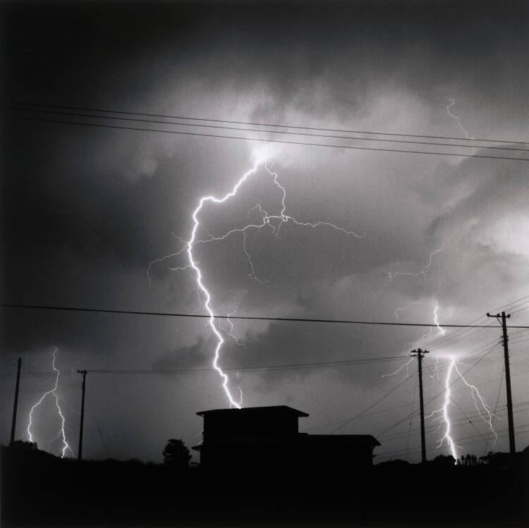 Reflecting the unpredictable nature of weather and sky, Shoei Tamura’s photographs deftly illustrate the power of primal forces and the interplay between nature and culture. Using a long exposure to capture multiple bolts of lightning in a single image, Tamura depicts the ragged energy of atmospheric electricity striking in eerily close proximity to a silent row of houses.