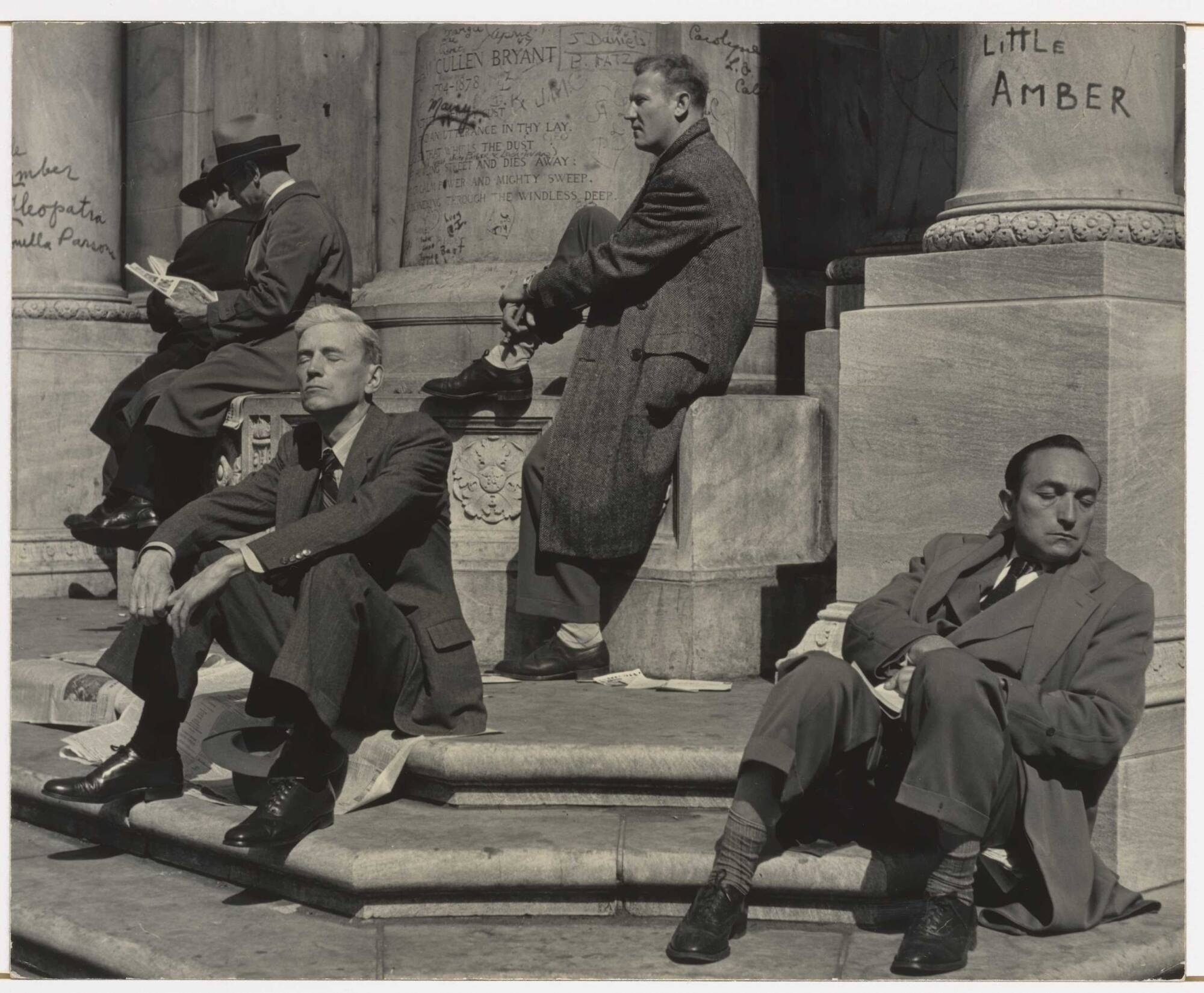 Though the men in this photograph sit near one another, they appear isolated in their own private worlds. N. Jay Jaffee reveals an experience of living in a city: though we may be surrounded by people, we can still feel alone. A native New Yorker, Jaffee returned to the city after serving in World War II. He purchased his first camera in 1947 and began taking photography classes at a union hall with Sid Grossman.