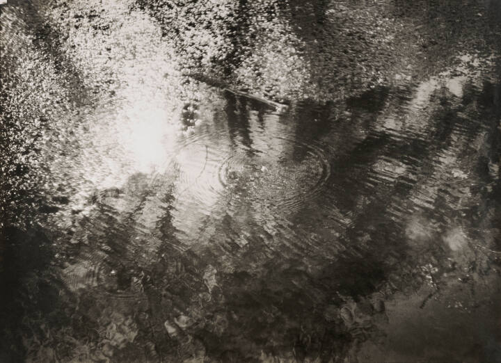 In this photograph, the rippled surface of water appears to both reflect and be dissolved by light. The graininess of this image is the result of its enlargement from a 35 mm negative. This effect creates further confusion to the eye, imparting a sense of mystery to the mundane.