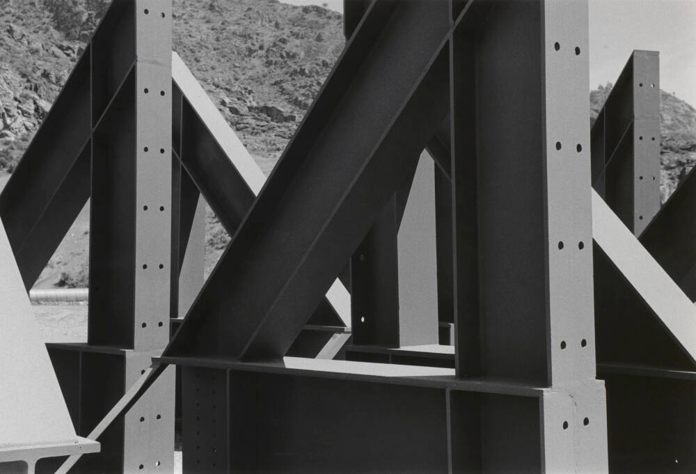 DescriptionVintage print. Detail image of large beams with small uniform holes drilled into the vertical sections. The beams intersect forming triangular shapes; rocky hillside in the background.ProvenanceHallmark Cards, Inc., New York, NY, 1995;