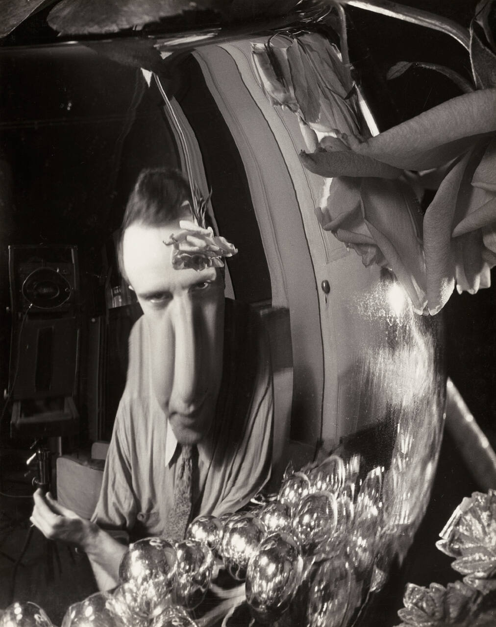 DescriptionImage of man beside a large camera; his image is elongated in a reflective orb. A large rose is in the upper right corner and another single stem rose hangs upside down in front of the man's forehead.Exhibition HistoryRotation 15. The Nelson-Atkins Museum of Art, Kansas City, MO, June 19, 2013 – January 5, 2014, no cat.