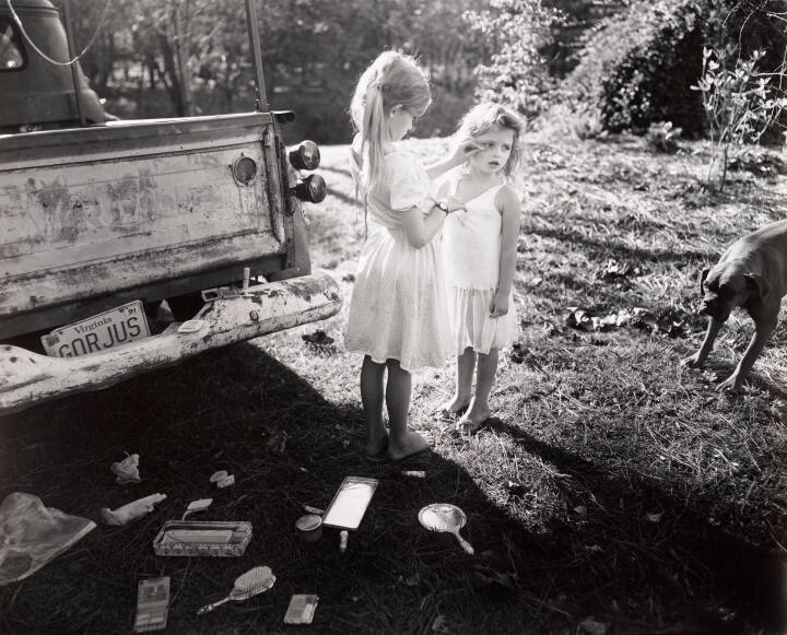 Sally Mann’s intimate portraits of her children convey both the innocence and candor of childhood. Mann took this photograph on her family property in rural Virginia. Her daughtersJessie (left) and Virginia (right) play dress-up behind a pickup truck with a license plate that reads "Gorjus." The picture suggests both the romantic ideals of white Southern girlhood as well as the individual personalities of the girls themselves.