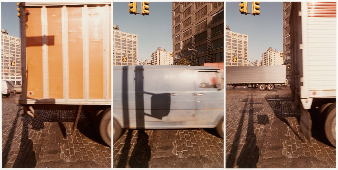 DescriptionTriptych of trucks on a cobblestone road in front of commercial buildings. The center image of is a blue van. Each has long shadows cast from a nearby street light and onlooker.Gallery LabelStanding on the same street corner in New York City, Jan Groover made three photographs in short succession. In each image a different truck overtakes the frame, distorting Groover’s and the street signposts’ long shadows. After first working as a painter, Groover began making photographs in the 1970s. She took inspiration in her early photographs from historic art forms like the triptych, a painting made in three parts.
