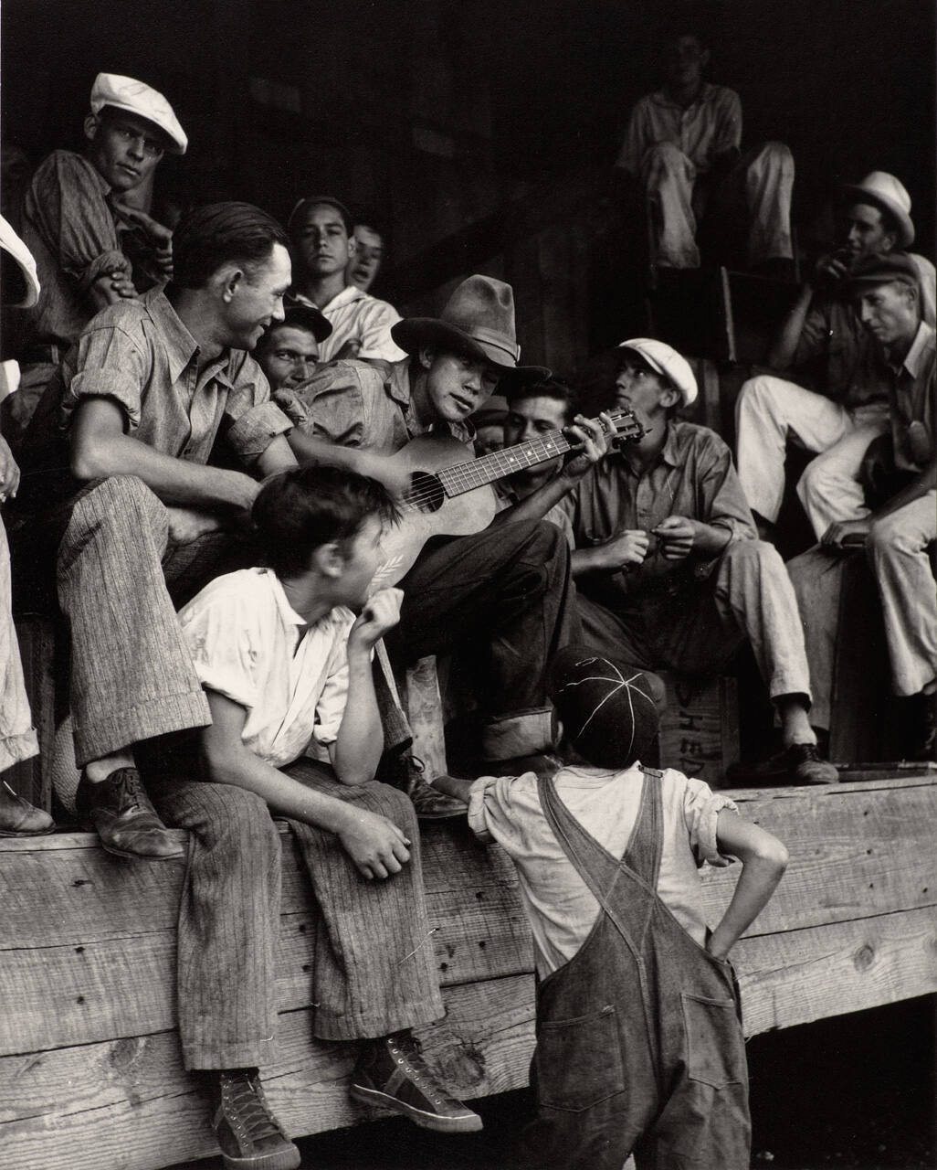 DescriptionImage of a group of men and young boys gathered around a man playing the guitar.Copyright© Eudora Welty, LLC
