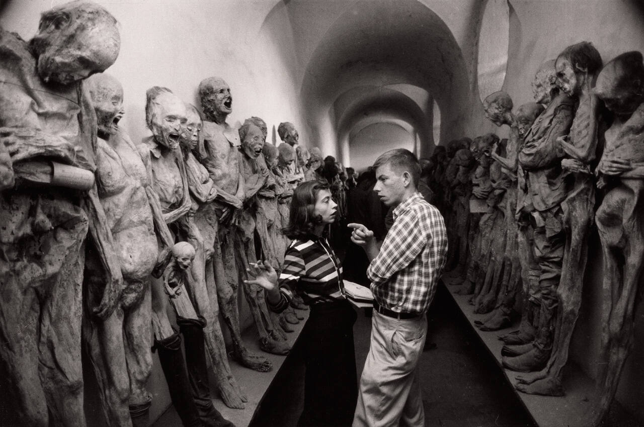 commercial photographer since the early 1950s, he has also been one of the most notable artistic photographers of this era. As suggested by this view of two students conversing in the crypt of a Mexican church, Erwitt’s images are characterized by their witty and at times surreal juxtapositions.