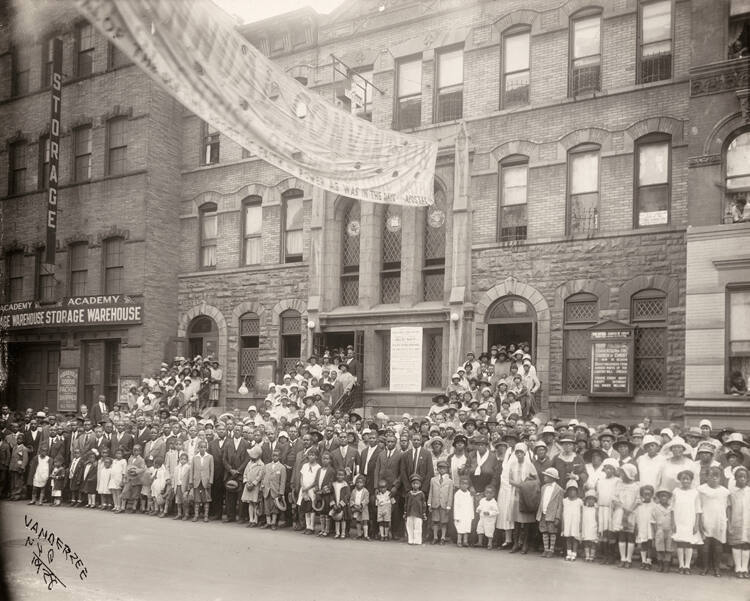 DescriptionA large group of people standing in front of a church (a Church of Christ Convention).Gallery LabelIn 1912, James Van Der Zee opened a commercial studio in Harlem. Throughout the Harlem Renaissance of the 1920s and 1930s, Van Der Zee made portraits and photographed various aspects of African-American middle class life: funerals, weddings, social clubs and gatherings (as seen here). As the official photographer for Marcus Garvey’s Universal Negro Improvement Association, he gained a unique perspective on the struggle of black Americans towards social and economic progress. Collectively, his images suggest a dynamic society structured by family, church and commerce.