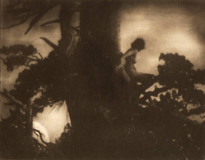 DescriptionDark image of a nude woman sitting on the branch of a tree and looking away from the viewer.Gallery LabelAnne W. Brigman, a long-time resident of Oakland, California, was a leading figure in the Pictorialist movement of the early 20th century. Her images exemplify several key traits: they are moody, poetic and symbolic, suggesting a pantheistic union of human figures and the larger forces of nature. As one critic of the time noted, in Brigman's photographs "all sense of separation between the human being and nature is gone, and both seem part of all that is beautiful in elemental conditions."