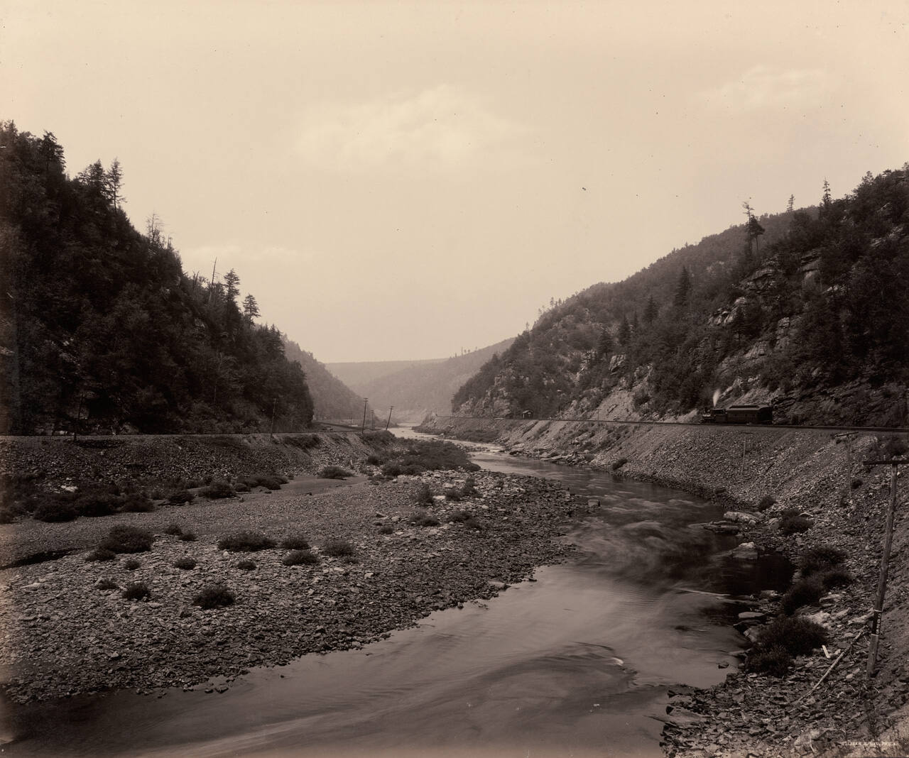 DescriptionVintage albumen print, rewashed and mounted in 1980's. Signature in negative. Scenic image depicting train, hills, stream.