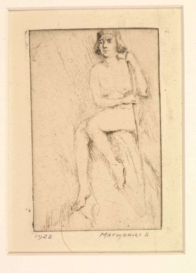 DescriptionNude woman seated atop mound, right, grasping staff with proper left hand atop, right arm across torso, hand holding staff at level of left elbow. Right leg straight down, left leg raised with back of foot held against mound. Head turned slightly left.