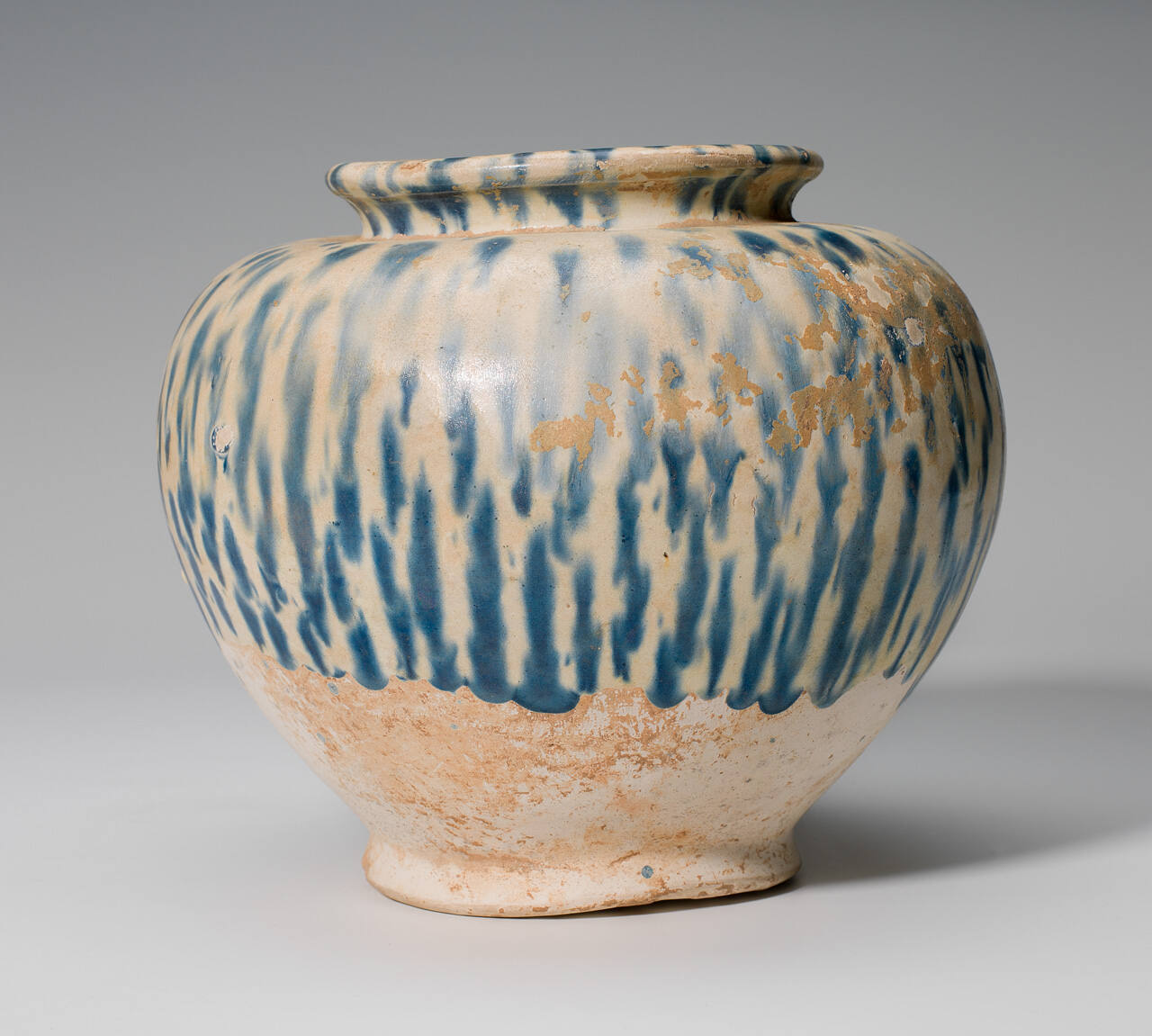 DescriptionFooted jar with a cream colored glaze dappled with blue.