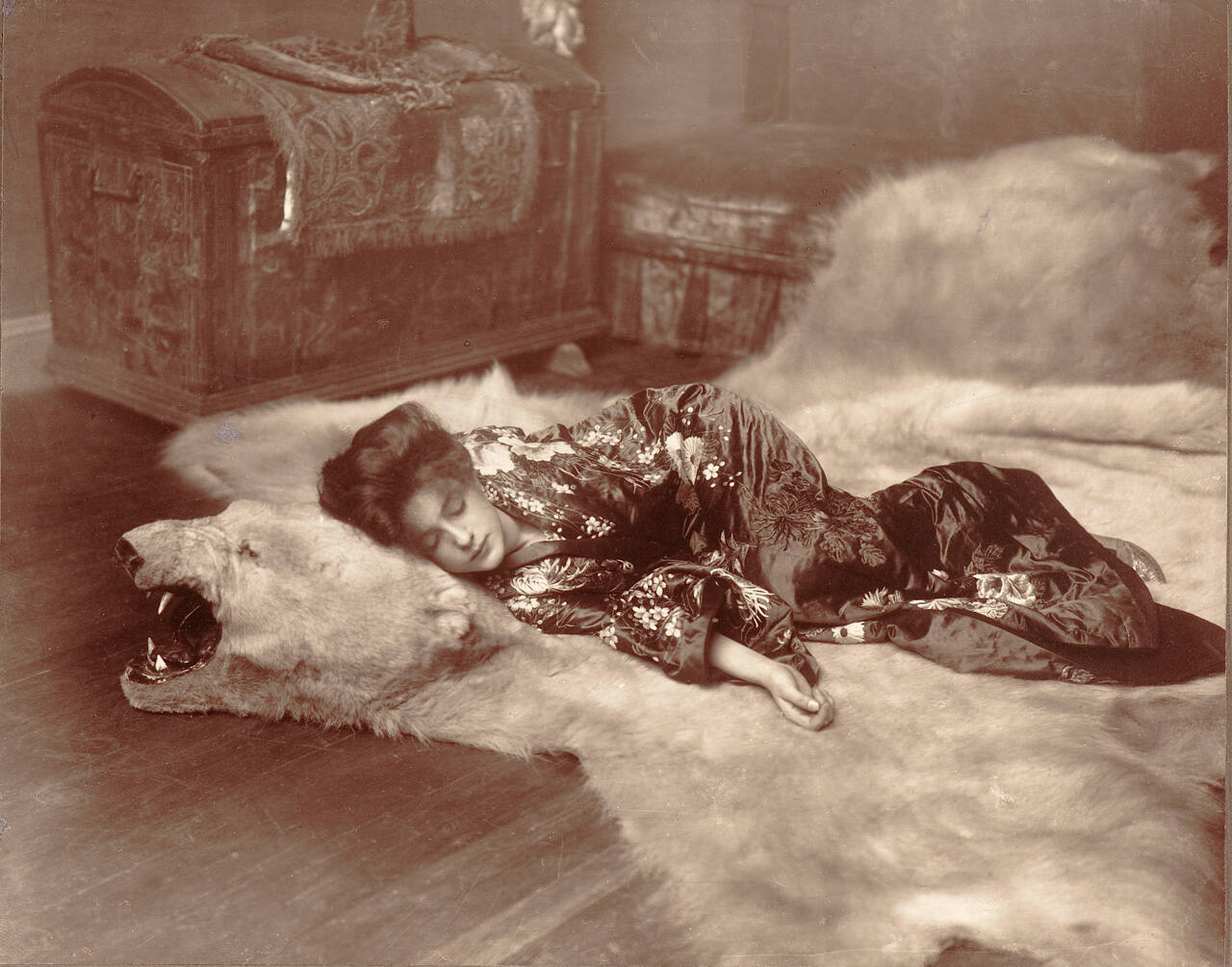 DescriptionImage of a woman in a floral dressing gown, lying on bear skin rug with her eyes closed.Exhibition HistoryIn the Public Eye: Photography and Fame. The Nelson-Atkins Museum of Art, Kansas City, MO, March 8 - June 15, 2008, no cat.