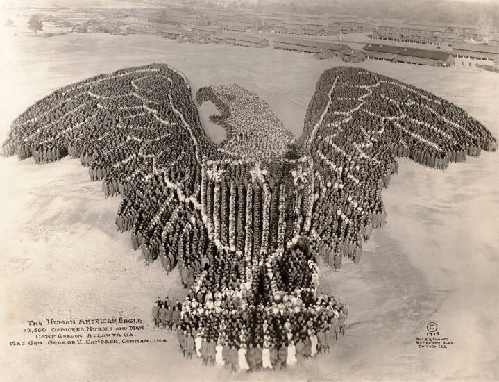 InscribedInscribed on negative, image recto, lower left corner: "THE HUMAN AMERICAN EAGLE / 12,500 OFFICERS, NURSES AND MEN / CAMP GORDON, ATLANTA GA. / MAJ. GEN. GEORGE H. CAMERON, COMMANDING”
