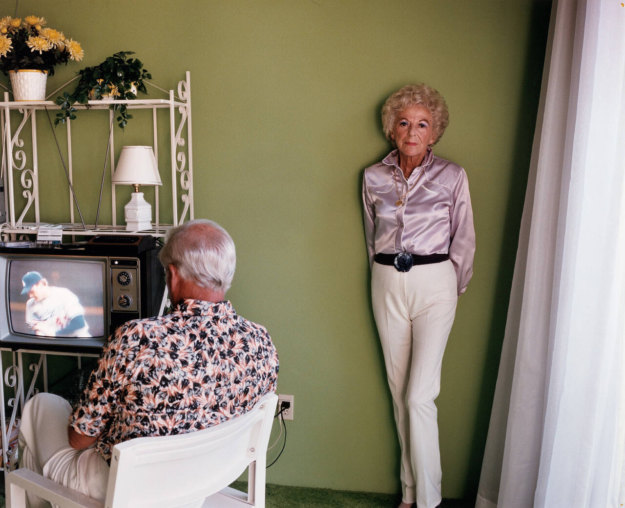 Larry Sultan’s rediscovery of home movies and snapshots made by his parents during his childhood inspired his series Pictures from Home. He responded to these nostalgic records by creating his own ambiguous documents of his retired parents’ life. With their (often puzzled) cooperation, Sultan posed his parents to express emotional, if not literal, truths about their lives, as seen in images such as this one.