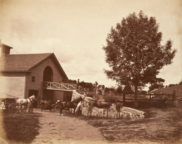 DescriptionImage of a two-story farmhouse with horses and wagons. A slightly sloping landscape leads up to a fenced area with cows, figures, and a tree.Gallery LabelSamuel Masury opened a daguerreotype studio in Salem, Massachusetts, in 1843, and by 1852 he had moved to Boston. In addition to his skills with that technique, Masury excelled with the new paper process-which he traveled to Paris to learn. This was one of several views Masury made of the estate of Charles Greely Loring, a prominent lawyer and the first director of the Museum of Fine Arts, Boston. This elegantly composed image strikes a perfect balance between nature and culture, landscape and human "improvements."