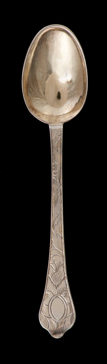 DescriptionOne of a set of 3 silver-gilt spoons (from an original set of 6), rat-tail with acanthus leaf decoration. The back and front of the stems are decorated with engraved scroll work. The backs of the spoons are also decorated.