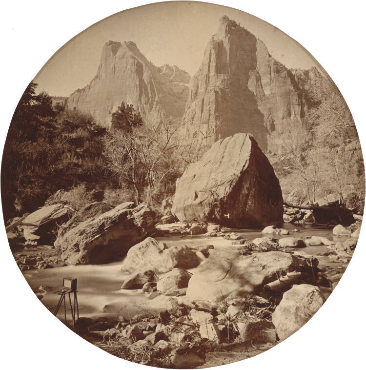 DescriptionCircular image of scenic mountain view in Zion National Park with a stream, large rocks, and a camera on a tripod in the lower left.Published ReferencesDon Fowler, The Western Photographs of John K. Hillers: Myself in the Water (Washington, D.C.: Smithsonian Institution Press, 1989).