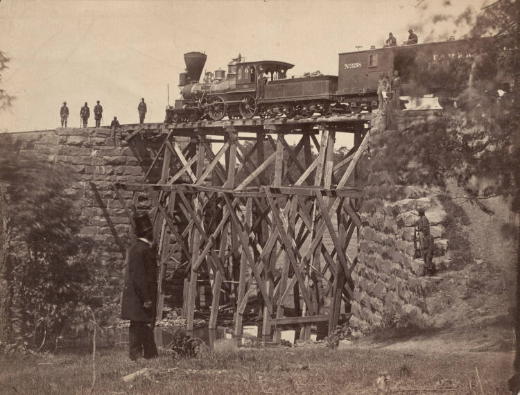 DescriptionImage of a train in the center of a bridge that is supported with cross-braced framework. A man wearing a suit, long jacket, and top hat looks toward the train from the grassy landscape below. Several other men appear on, near, and below the train.Gallery LabelAndrew Russell recorded this temporary bridge trestle while working for the Bureau of U.S. Military Railroads. A captain in the 141st New York Volunteers, Russell was also an artist and spent three months learning the wet collodion process. This technique was cumbersome and challenging. Russell hauled a portable darkroom and wrestled with fluctuating heat and humidity as he coated glass plates with a viscous substance (collodion), immersed them in a bath of silver nitrate, and exposed the wet plates in a camera to produce negatives. Russell soon became proficient as a photographer, documenting bridge engineering, train wrecks, and other subjects of military interest.
