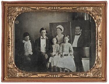 DescriptionImage of a group of children (2 boys, 2 girls) seated in front of two portraits (1 man, 1 woman). The girls are wearing buttoned sweaters over their dresses and dark fingerless gloves. This partially cased quarter plate daguerreotype is housed in a brass mat inside of brown leather tray with decorative motif.Exhibition HistoryRotation 25. The Nelson-Atkins Museum of Art, Kansas City, MO, October 19, 2018- March 17, 2019, no cat.
