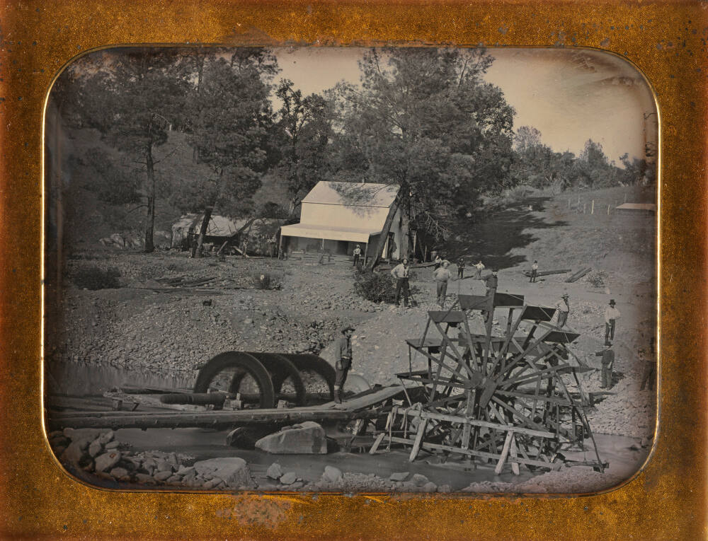 DescriptionImage of a man standing on a wooden platform near gold mining equipment including a paddled water wheel that is partially submerged in a body of water. Other men are scattered along the rocky hillside near a house and mature trees. This half plate daguerreotype is housed in a brass mat with rounded corners (no preserver) inside a traditional brown leather case with an embossed rust colored velvet liner. The case depicts a circular structure with columns and a tall plinth rising from the center.