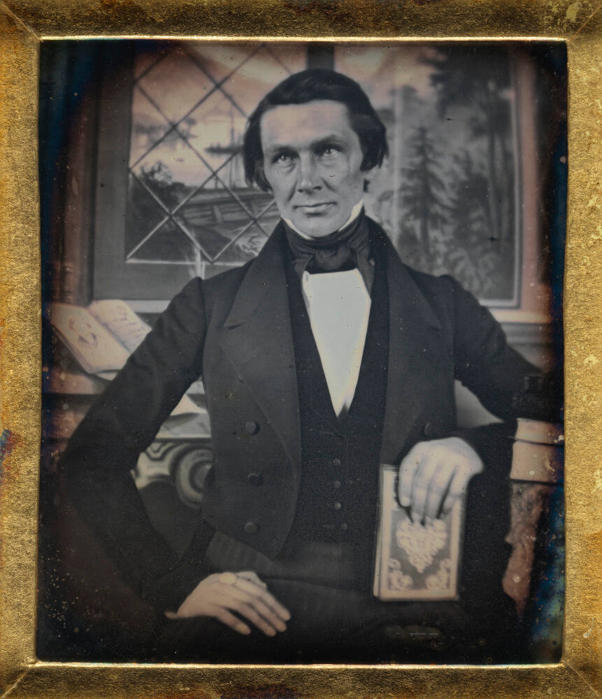 DescriptionImage of a man with an upward gaze wearing a suit and tie. He is seated and holding a book is his left hand. The background features a landscape scene outside of a window. This sixth plate daguerreotype is housed in a brass colored paper mat inside of a case with tiny flowers embossed at the corners and a brown velvet liner.Published References