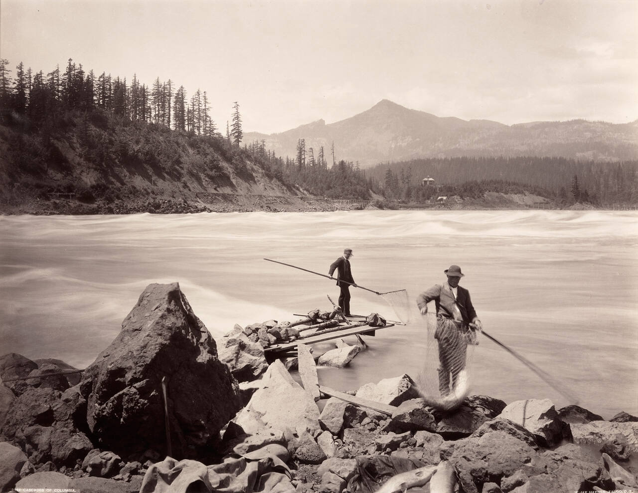 DescriptionScenic view of river, mountains, with two men fishing in the foreground.Gallery Label