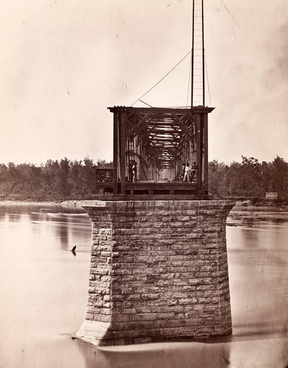 DescriptionImage of a iron railroad bridge with a large limestone pier and a ladder tethered above. Men stand along edges of the bridge and trees line the shoreline behind them.