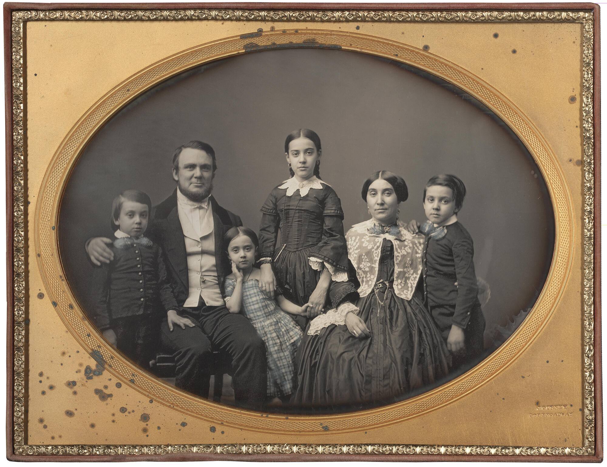 DescriptionImage of a nicely dressed group (man, woman, four children) seated with arms around one another. This whole plate partially cased daguerreotype is housed in an oval brass mat inside of an embossed paper covered wooden tray with gold tooling around the perimeter.Exhibition HistoryRotation 25. The Nelson-Atkins Museum of Art, Kansas City, MO, October 19, 2018- March 17, 2019, no cat.
