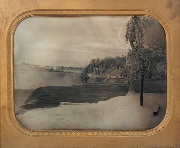 DescriptionImage of waterfalls winding around icicle-covered trees; a snow-covered grass fills the foreground. This whole plate framed daguerreotype is housed in a brass mat.Published References