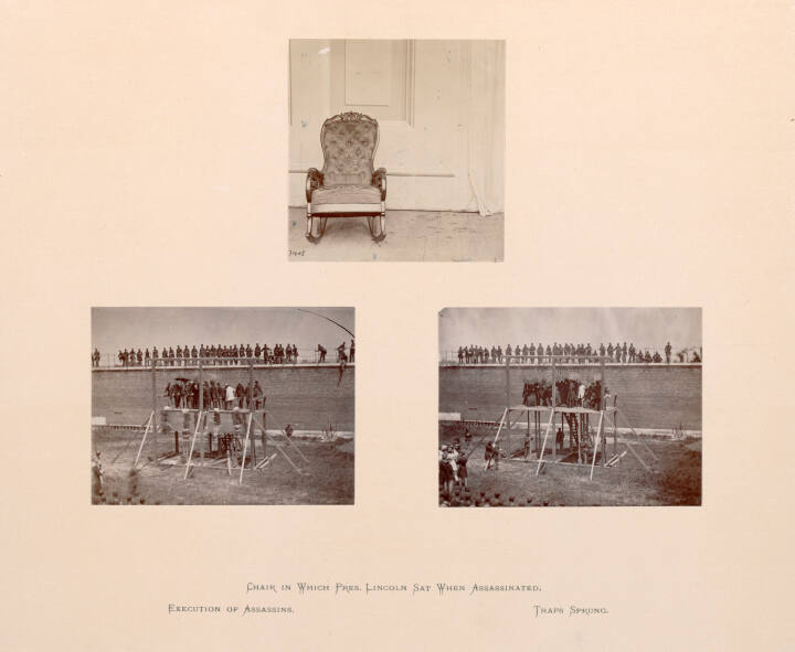 DescriptionThree individual prints mounted on one board. Top image is of a tufted rocking chair ; Lower two images are of a public hanging (Lincoln conspirators).Gallery LabelThe U. S. Secret Service called upon Alexander Gardner to photograph the hanging of those convicted for the assassination of Abraham Lincoln. The upper photograph depicts Lincoln’s chair. The lower two images from the execution series depict the moments before and after the traps sprang. Visible in a white waistcoat and hat, Captain Christian Rath served as the chief executioner and designed the gallows himself.
