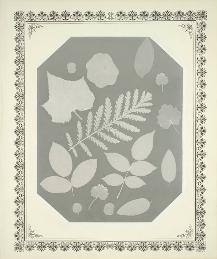 DescriptionImage of leaf shapes evenly spaced around a fern in the center.Gallery LabelAmerican photography before 1880 was largely a professional pursuit, though the democratic nature of the medium also inspired many amateurs to try their hand. One such figure was Amelia Bergner. She created an album of photograms (which included this page) of elegantly arranged botanical specimens. These images were formed by placing the leaves directly on a sheet of sensitized paper and exposing it to sunlight. When the paper was developed and fixed, these shadow images remained as detailed impressions.