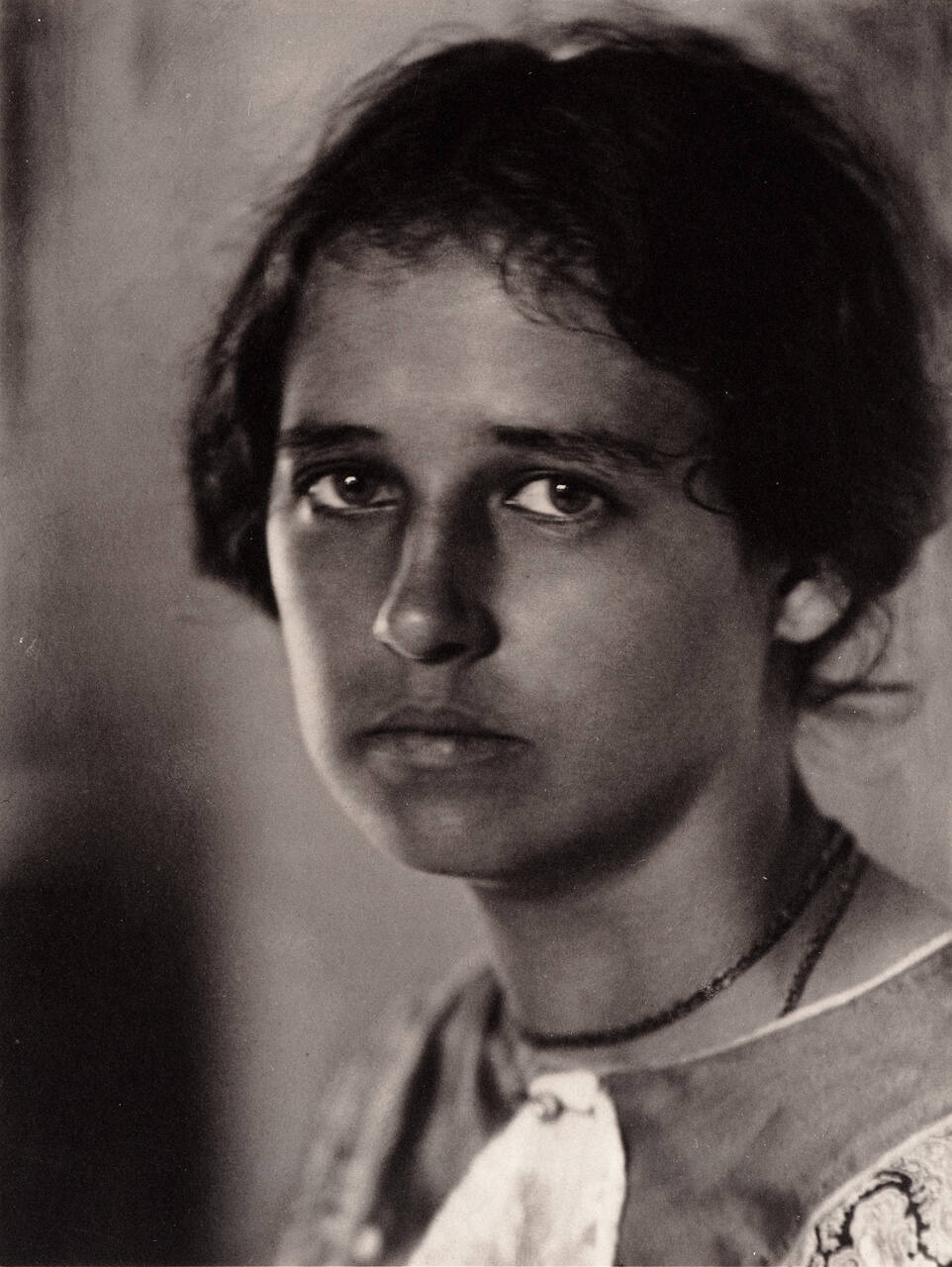 DescriptionDark image of a young woman with light shining on the right edge of her face.