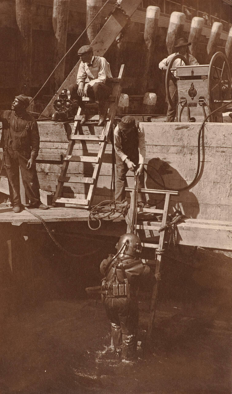 Very little is known about Dr. Albert Benedict. A resident of Montclair, New Jersey, Benedict was an amateur photographer working within the Pictorialist aesthetic. His work was often awarded prizes in the amateur photography competitions from 1900 to 1915. In his view of divers, seen here, Benedict employs the muted focus of Pictorialism while celebrating a prototypically modern subject: divers setting footings that will later support a new suspension bridge.