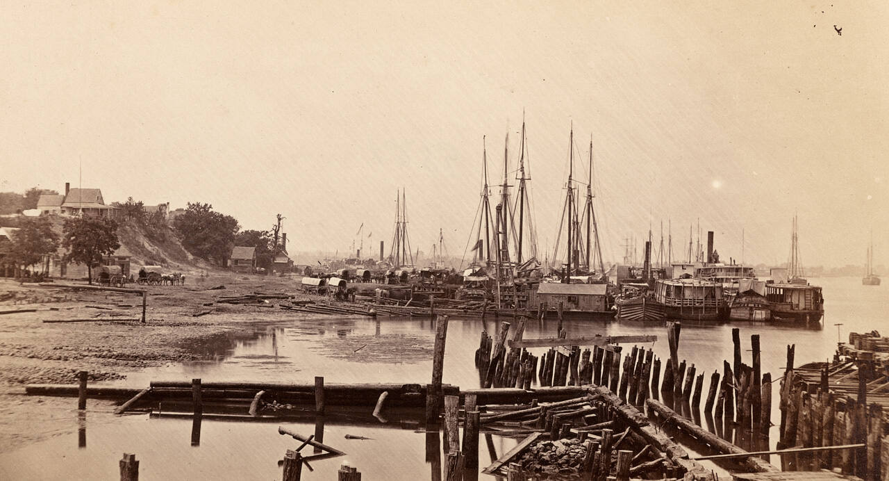 DescriptionVintage albumen print of ships in harbor on James River. On original mount. Inscribed in pencil on back of mount.