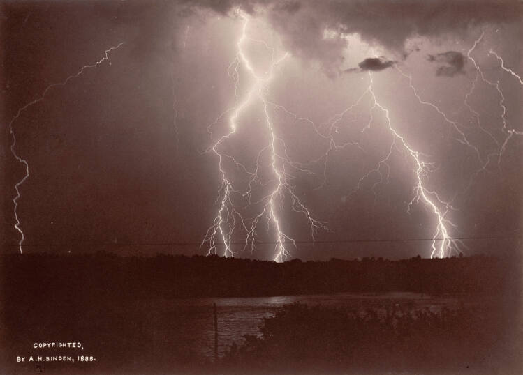 By the late 1870s, the sensitivity of photographic emulsions had increased significantly, allowing a new world of natural phenomena to be photographed. Lightning was a particular challenge, and A.H. Binden of Wakefield, Massachusetts, achieved some of the most notable results in the field. This image, his best-known photograph, was made on the evening of June 23, 1888. Like the work of Muybridge, Binden’s image was valued for revealing the unexpected complexity of familiar things. Here, Binden magnifies the inherent abstraction of this subject by allowing multiple lightning strikes to be recorded in the span of a single extended exposure.