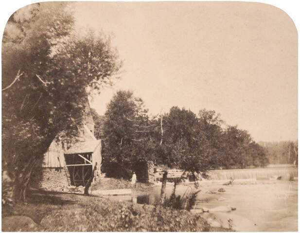 DescriptionImage of a wood building with a stone foundation and a water mill. Two figures stand just outside the building beside a river with a dam.Gallery LabelFrederick De Bourg Richards was active for many years as both a photographer and landscape painter. He was one of the earliest Americans to take up paper photography. This picturesque work, made in June 1854, was one of Richards' earliest and most admired paper photographs. It depicts an old mill, built in 1728 on the Brandywine River near Wilmington, Delaware. It is interesting to consider that Americans of this period were already growing nostalgic for the simpler life of "olden times."