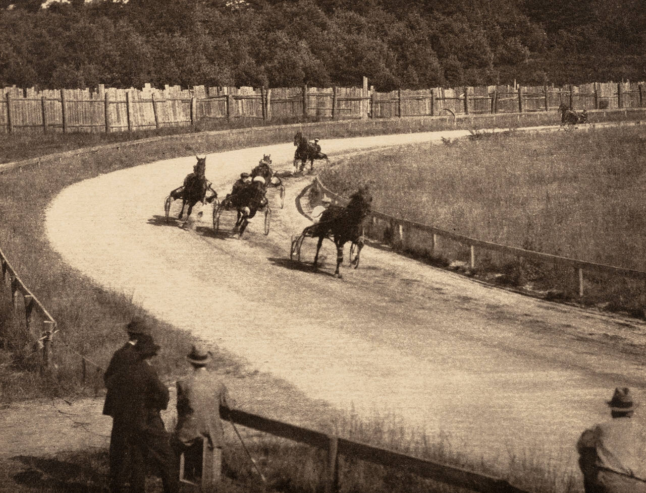 DescriptionVintage gelatin silver print of horse race on exhibition mount.