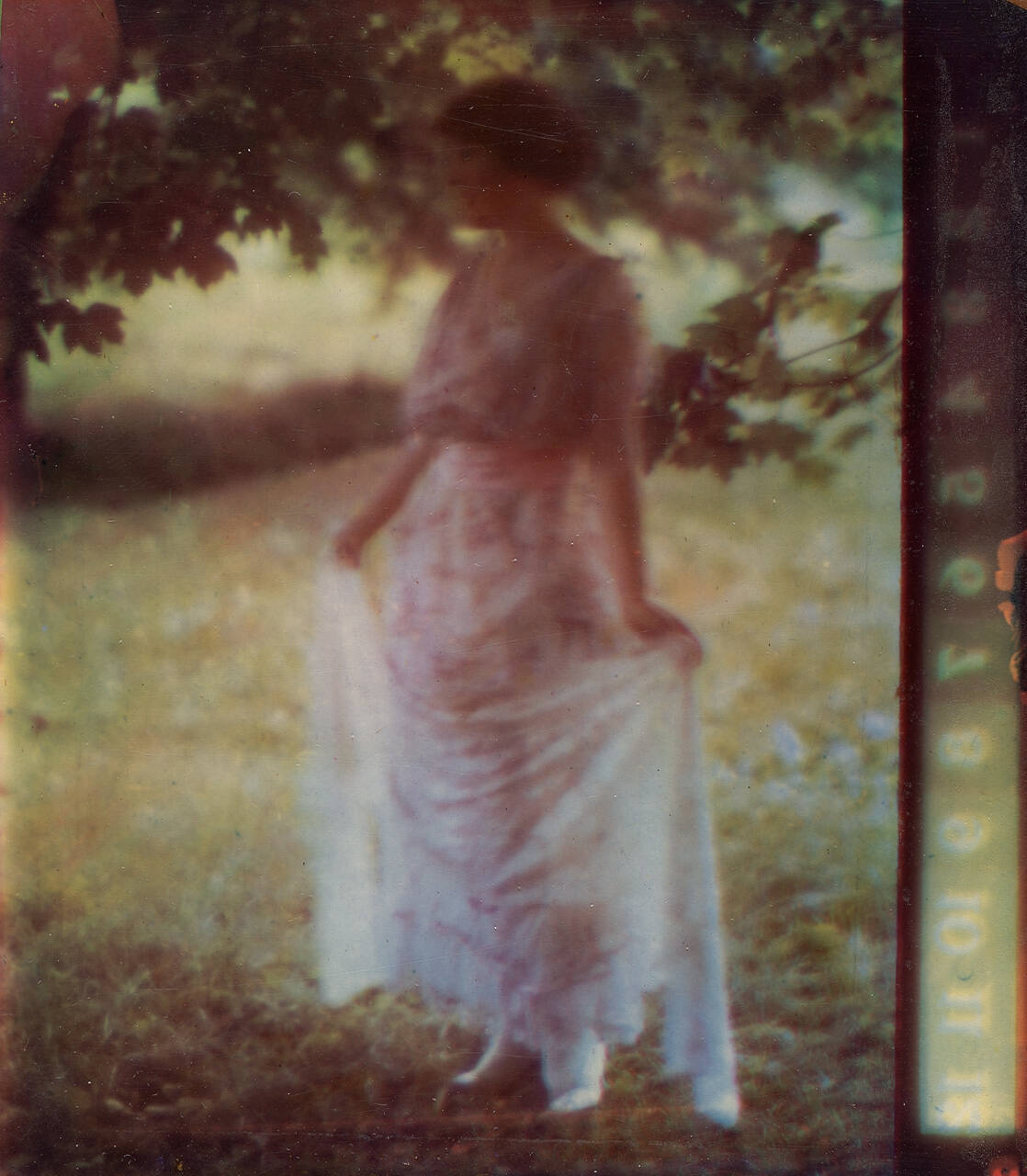 DescriptionVintage Hicrome (Hess-Ives) color print on original mount with manufacturer's and patent data; accompanied by 540-2-97 (platinum print of same subject). Image of a woman (Hebe Holister) wearing a thin dress.