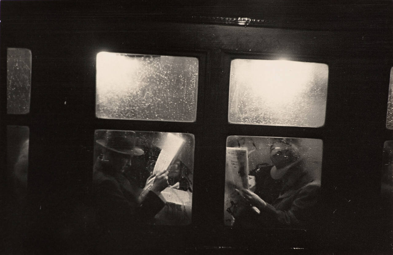 DescriptionImage of two men in hats sitting across from one another on a train, reading the newpaper. Figures are seen through the window.Gallery LabelTosh Matsumoto photographed evening commuters, in part, out of practicality. As a professional printer, he spent his days in darkrooms, leaving little daylight to make his own pictures. With its individual rectangular windows, this off-kilter photograph of men in a subway car resembles a contact sheet or film strip.
