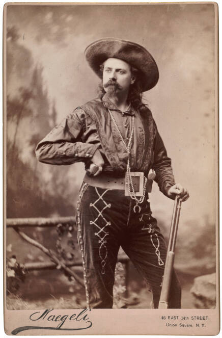 DescriptionImage of a frontiersman (William F. Cody) standing with one hand on the barrel of a shotgun, the other on the handle of a gun tucked into his belt. He wears an embroidered shirt, wide brimmed hat, and pants with a large belt buckle.Gallery LabelThe cabinet card was introduced in the 1860s and remained popular through the 1890s. This format was favored by collectors of mass-produced portraits of celebrities such as these: the famed abolitionist Frederick Douglass, the author of the bestseller Uncle Tom’s Cabin, Harriet Beecher Stowe, and the western explorer and showman Buffalo Bill Cody.