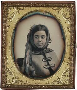 DescriptionImage of a young girl wearing a coat with a knitted scarf wrapped around her head. This sixth plate cased daguerreotype is housed in an oval brass mat inside of a Union Case with Link and Scroll Motif with Diapered Center and embossed burgundy velvet liner.Published References