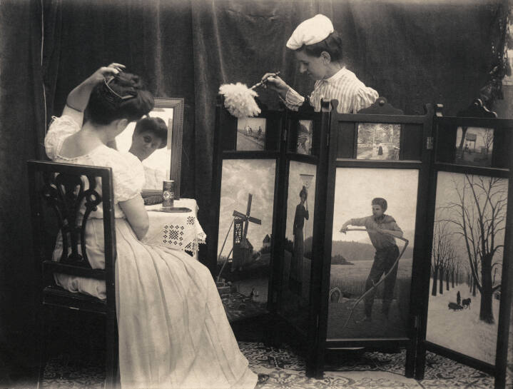 DescriptionImage of a woman wearing a long dress seated facing mirror. Beside her, a woman dusts a folding screen depicting outdoor images.Gallery LabelThis intriguing scene features a woman (likely the photographer herself) adjusting her hair in a mirror, while a maid dusts a folding screen to her right. The images on the folding screen depict farmers, suggesting a connection between domestic work (as symbolized by the maid) and outdoor labor. Such genre scenes, showing everyday activities, were common subjects for amateur photographers, like Bernard, who exhibited her works in photography contests and camera club exhibitions across the United States between 1890 and 1910.