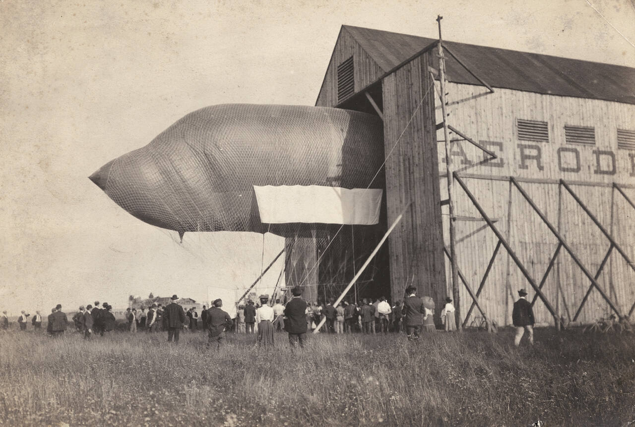 DescriptionImage of an air ship, draped with a net, coming out of the front doors or a large barn. A crowd is gathered in the grassy landscape.